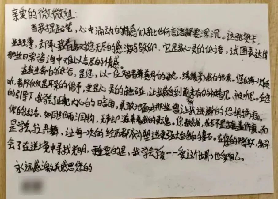 “亲爱的微微姐姐,当我提到笔的时候,我的心似乎比任何一句话都深。这张贺卡虽然轻薄,却承载着我对你无尽的感激和敬佩。它是我灵魂的细语,试图在日常咨询中传达无尽的情感……”