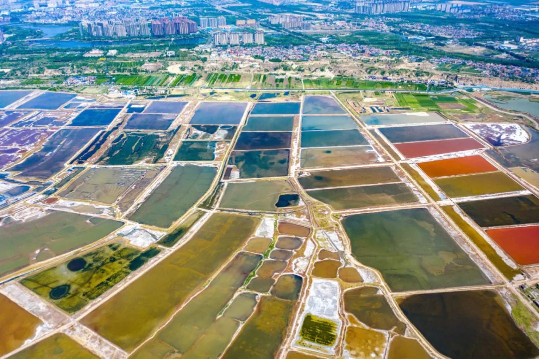 2024年漫长的夏季,随着气温的不断升高,位于山西省运城南部的运城盐湖呈现出色彩斑斓的美景,俯瞰空中就像一块块天然的“调色板”,成为一道独特的风景线。