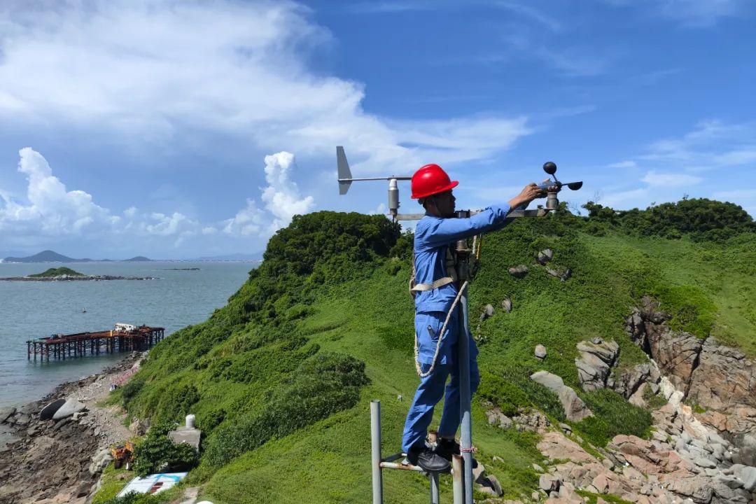 2024年7月20日, 台风“派比安”影响前夕,广东省茂名市气象局工作人员乘船前往大竹洲岛,在高温热浪下修复岛屿自动气象站,确保数据传输准确。