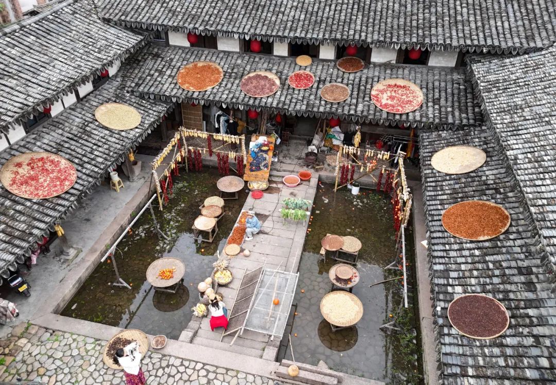 2024年11月17日,辣椒、南瓜、玉米、柿子等农作物在浙江省温州市永嘉县苍坡古村落的晒架上色彩斑斓,构成了特色乡村美景。