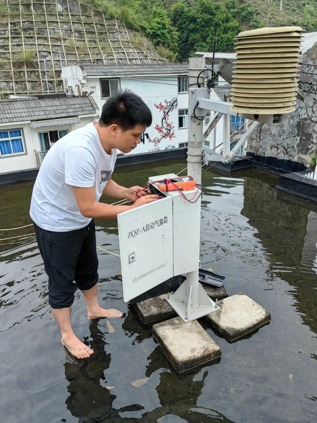 2024年5月17日,贵州省黔西南布依族苗族自治州册亨县气象局工作人员在强降水到来之前,及时对雨量监测站进行维修。