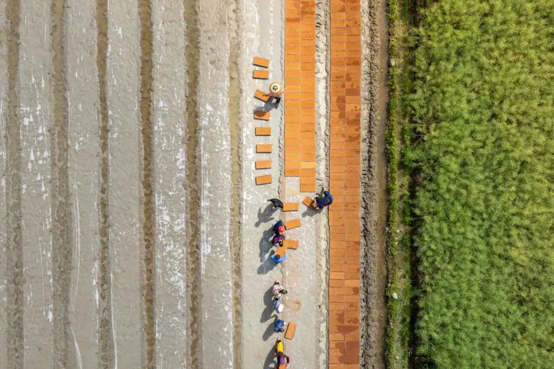 2024年4月19日,在贵州省铜仁市万山区黄道乡田坪村,村民们在农田里整理秧床,抛洒谷种,绘制耕作画轴。
