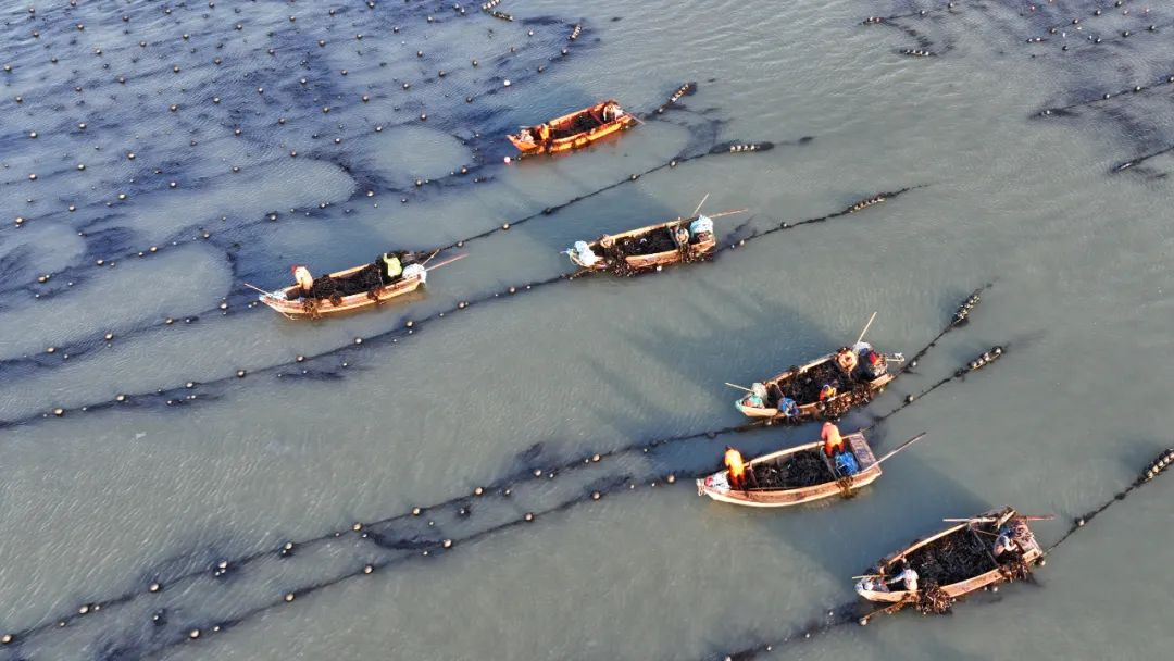 2024年3月2日,在山东荣成爱伦湾海洋牧场,养殖工人在海带养殖区开着养殖船,正处于海带春管的关键时期。养殖工人整理海带养殖筏架,切割海带,提高海带的产量和质量。