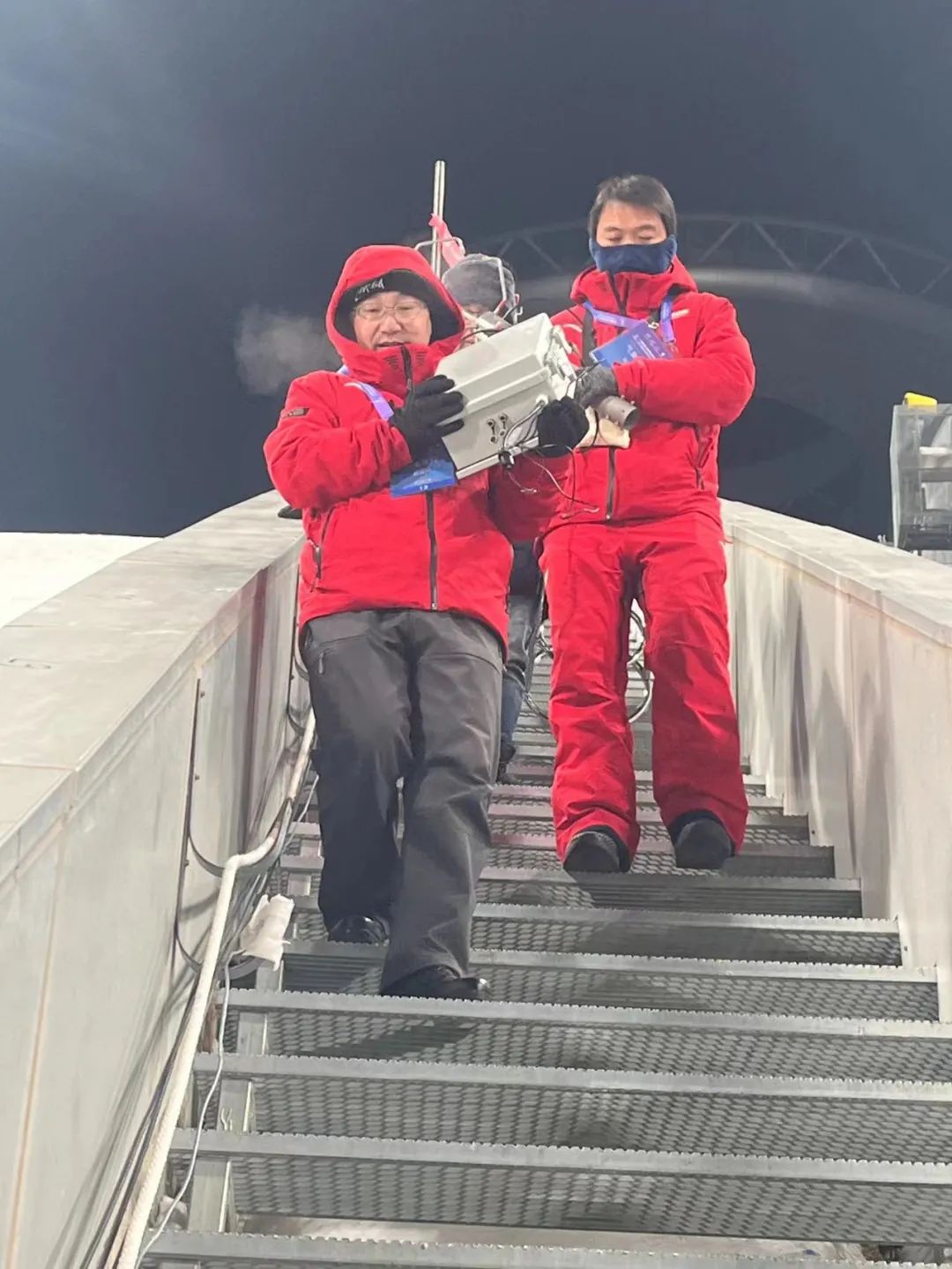 2024年2月1日晚,第十四届全国冬季运动会张家口赛区国家跳台滑雪中心,气候设备保障人员正在运送气象观测设备,此时室外温度只有零下20℃。