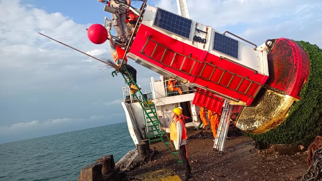 海南省海口市气象局工作人员于2024年5月13日对琼州海峡航标站1号进行检查,确保琼州海峡气象监测顺利进行。