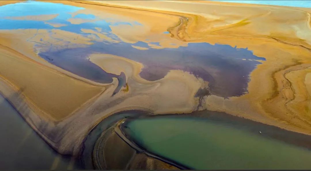 2024年6月下旬,由于降雨量小,黄河流域东阿段流量明显减少,裸露的河流和水体相互配合,画出了一幅“巨画”。