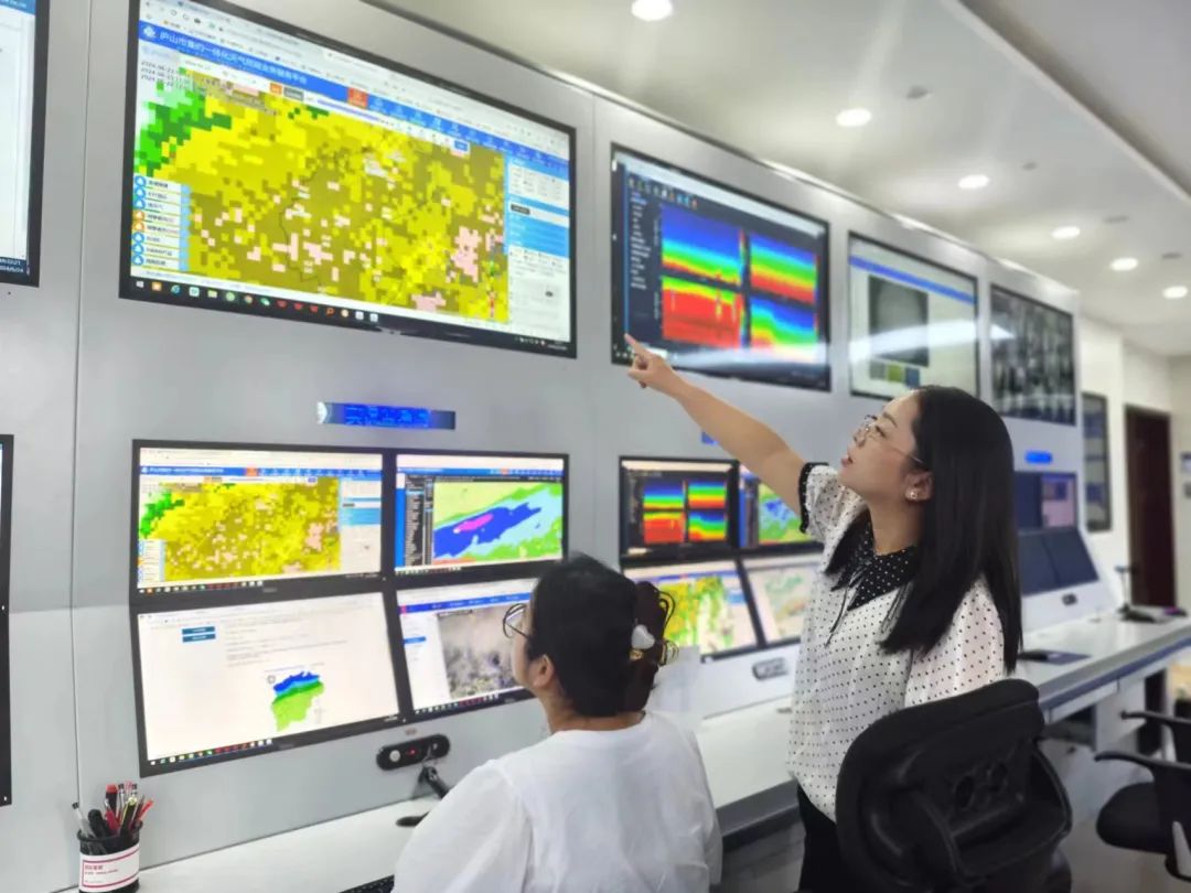 江西省庐山市气候工作人员于2024年6月23日整夜坚守暴雨一线,分析判断天气状况。