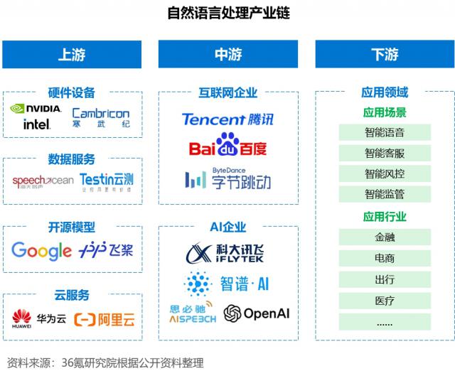 产业链中游为 NLP 技术和产品研发,服务。这里聚集了许多先进的自然语言理解技术,如基于深度学习的神经网络模型,包括循环神经网络。(RNN)、长时间记忆网络(LSTM)、注意力机制(Attention)以及近几年流行的 Transformer 架构等。互联网公司和主要竞争对手可以分为 AI 公司、互联网公司拥有完善的产品生态、丰富的产品经验和数据以及庞大的客户资源,可以利用 C 终端优势促进产品创新和应用。AI 企业具有较强的技术积累,以垂直领域和细分场景为切入点,布局多行业进行定制化产品开发。