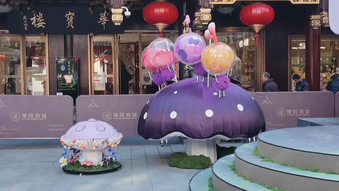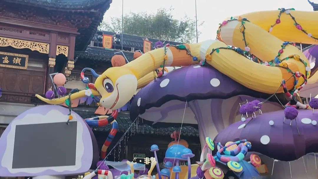 今年豫园灯会中心广场的大型主灯组“天地人和,金蛇献瑞”吸引了很多关注。灵蛇、蘑菇、菌人等元素巧妙融合,主色调为紫黄色,呈现出独特的自然愉悦景象。很多市民提前来灯会打卡,许下新年的美好祝愿。