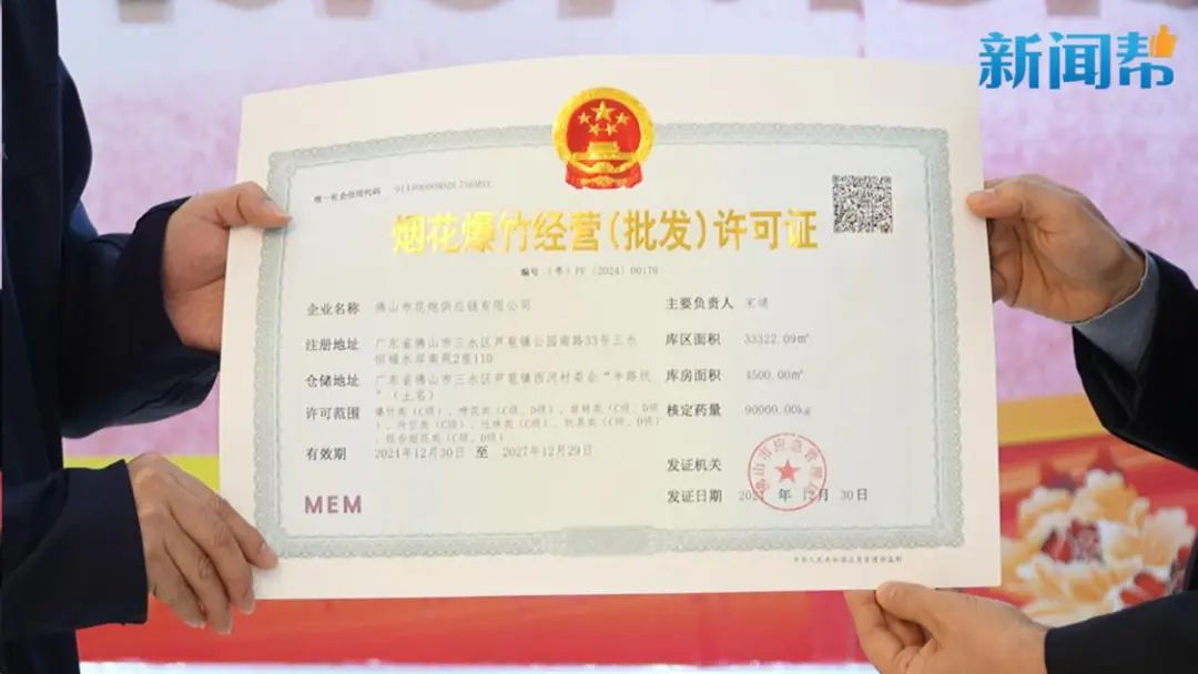12月30日上午,佛山市首张烟花爆竹经营批发许可证由佛山市食品物资集团有限公司下属企业佛山市花炮供应链有限公司取得批发许可证。(来源:佛山 )