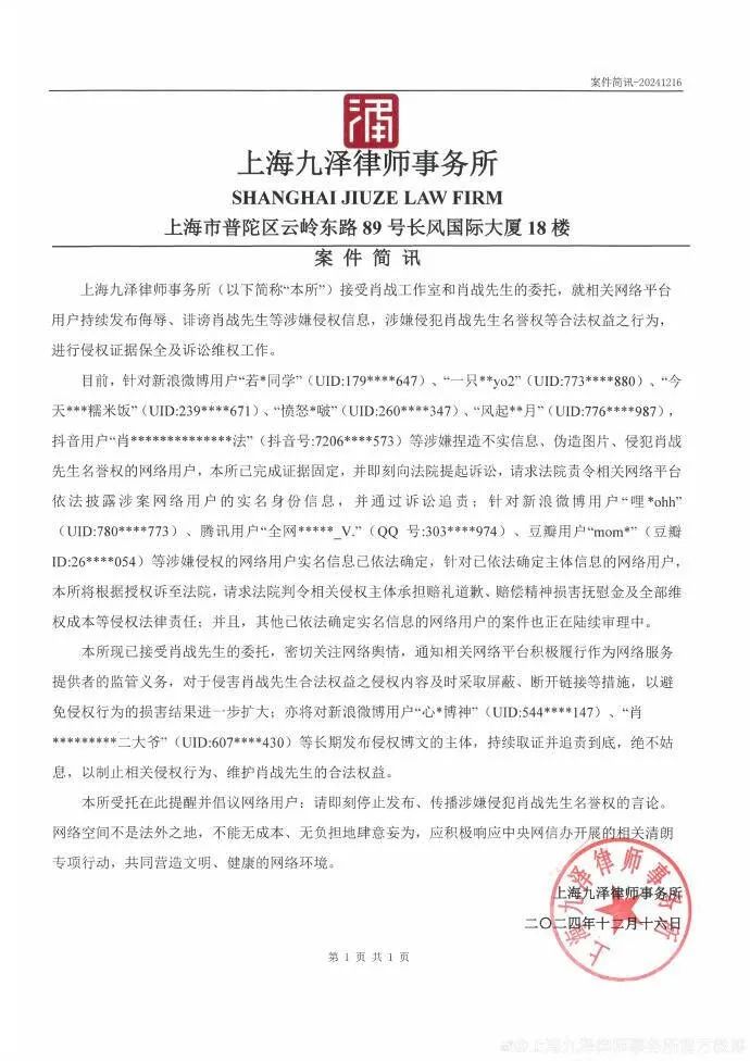 此前,肖战方发布了维权最新进展,持续发布侮辱、诽谤肖恩肖等涉嫌侵权信息,涉嫌侵犯肖恩肖名誉权等相关网络平台客户的合法权益,保全侵权证据和维权诉讼。