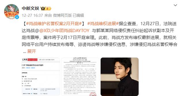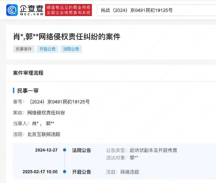 根据天眼查,十二月二十七日,法院送达肖战与郭某某网络侵权责任纠纷起诉状副本及开庭传票等,案件将于二月十七日开庭审理。