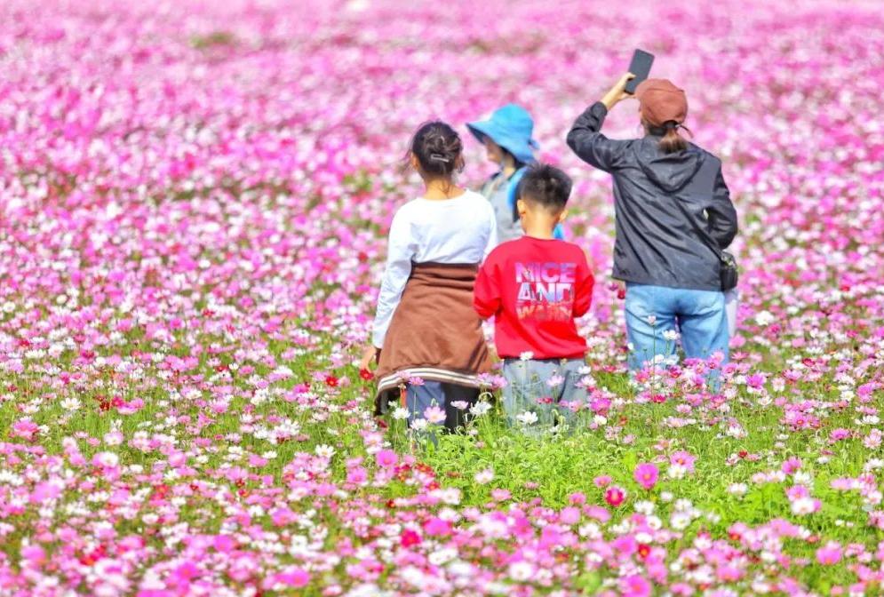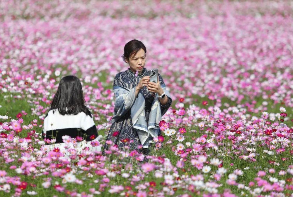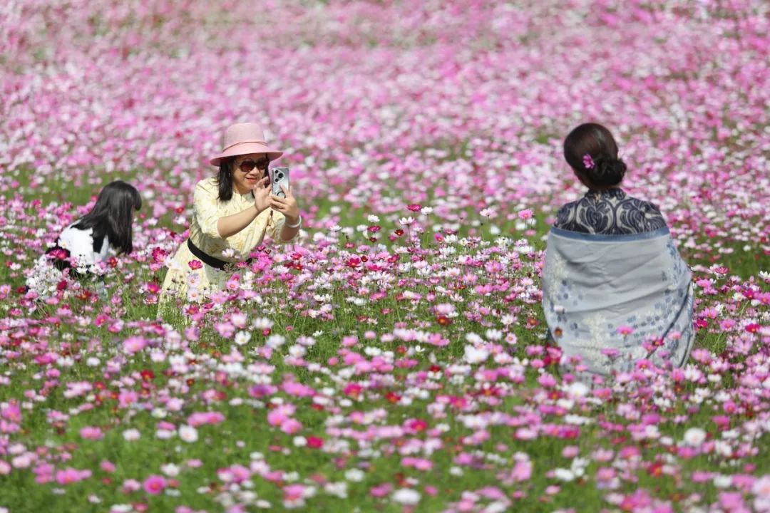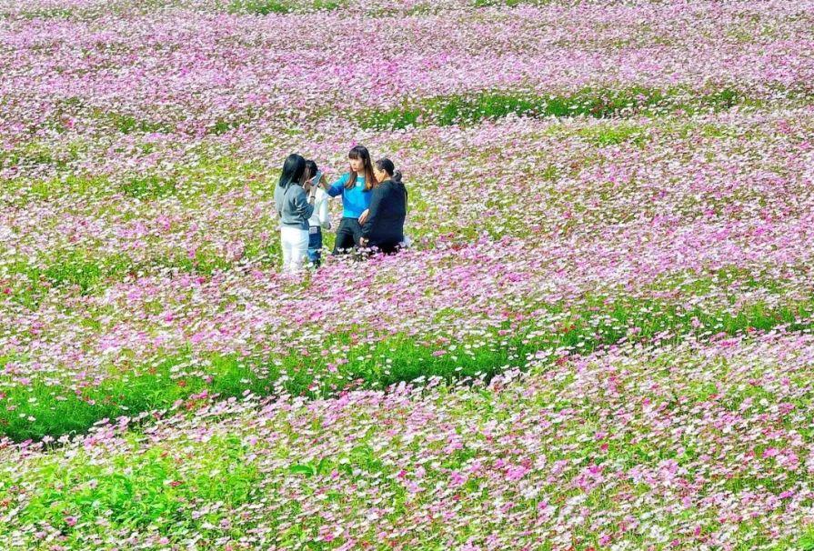 格桑花象征着“美好时光”和“幸福”,其丰富多彩的颜色深受藏族人的喜爱。这几天,这片花海吸引了许多市民和游客来赏花和拍照。游客们精心打扮,走在花丛中,享受美好的时光。摄影师还拿起相机,记录下这幅美丽的画面。