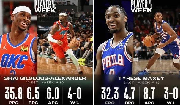 NBA 更新官方宣布马克西、亚历山大当选上周东、西部最佳球员。