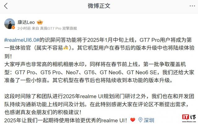 IT 世家 12 月 30 日消息,realme UI 产品经理 @康达 Leo 今天发文透露,realme UI 识别屏幕问答功能将会出现 2025 年 1 相机相册水印功能将于月中上线,春节前上线。