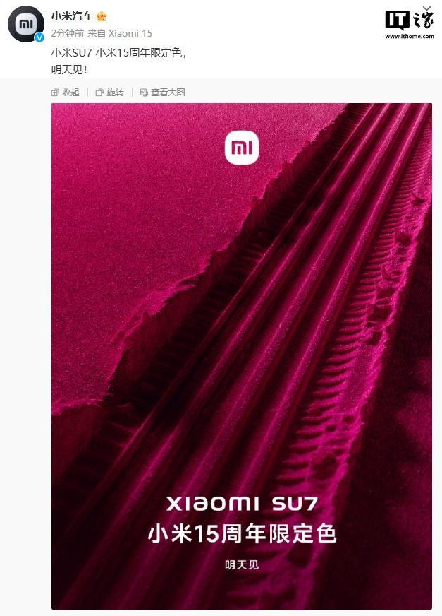 IT 世家 12 月 30 日消息,小米汽车今天宣布,小米汽车 SU7 小米 15 年度限色,明天见。雷军透露,再过 2 天,便是 2025 2008年,小米创业十五周年。