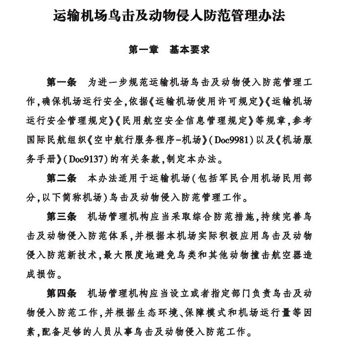 在这方面,中国民航局对机场提出了要求,例如《运输机场鸟击及动物入侵防范管理办法》,设立或指定部门负责防止鸟击和动物入侵。,有足够配置的人员主要从事。