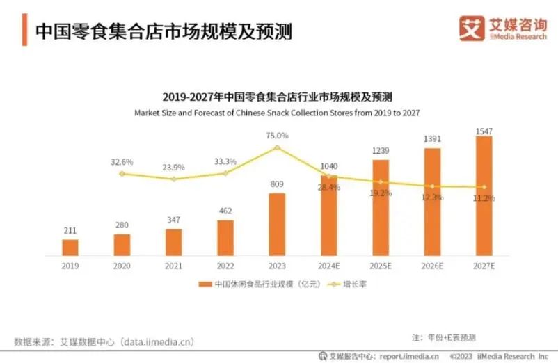 但是,盐津店必须面对的是,大量销售零食的渠道收入正在消散。根据艾媒咨询数据,2024年,中国零食集合店市场规模达到1040亿元,同比增长28.4%,增速下降46.6%。而且,预计未来几年,中国零食集合店市场同比增速将持续下降,2027年可降至11.2%。