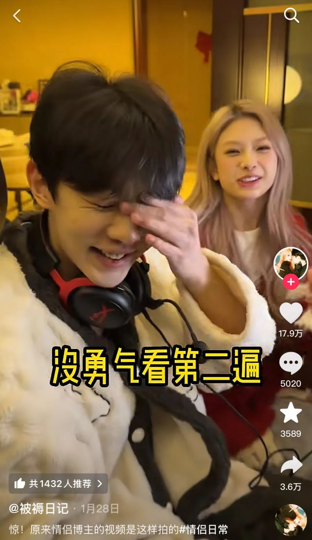 还有一种打假视频很受欢迎。他们假装是恋人,然后从第三个角度拍摄他们的爱情场景。早起的时候,一个头上有相机的男朋友叫你。你刚要因为一些情绪哭了,他的怪脸就上来了。很多人说,如果恋人博主的角度是这样录的,就不能带进来。