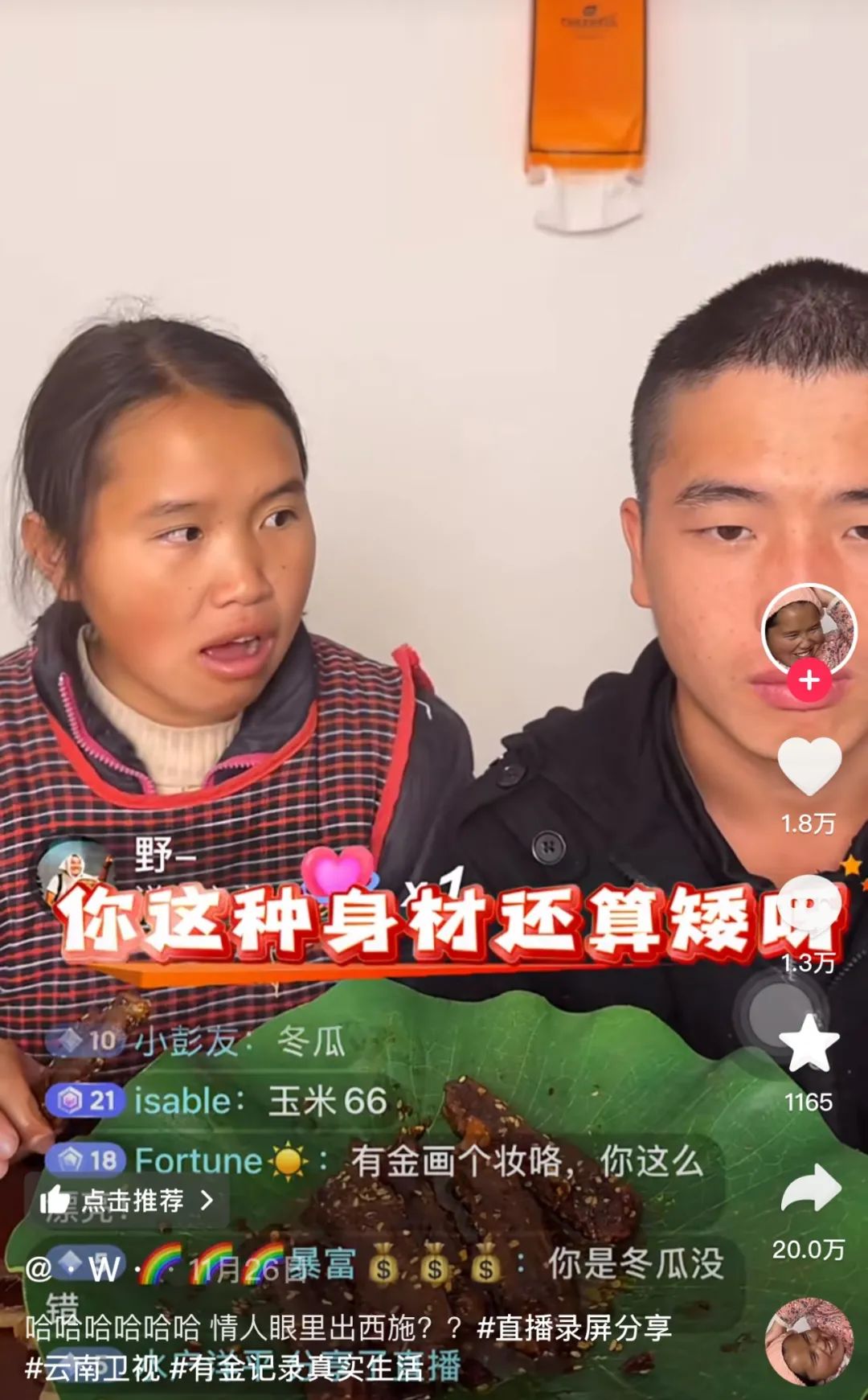 果然,云南人拍抖音就像喝水一样。但是群众的情感需求这么快就转向了,从看苦瓜大队笑小英的爱情大脑,到吃金色和紧身衣的爱情大脑?