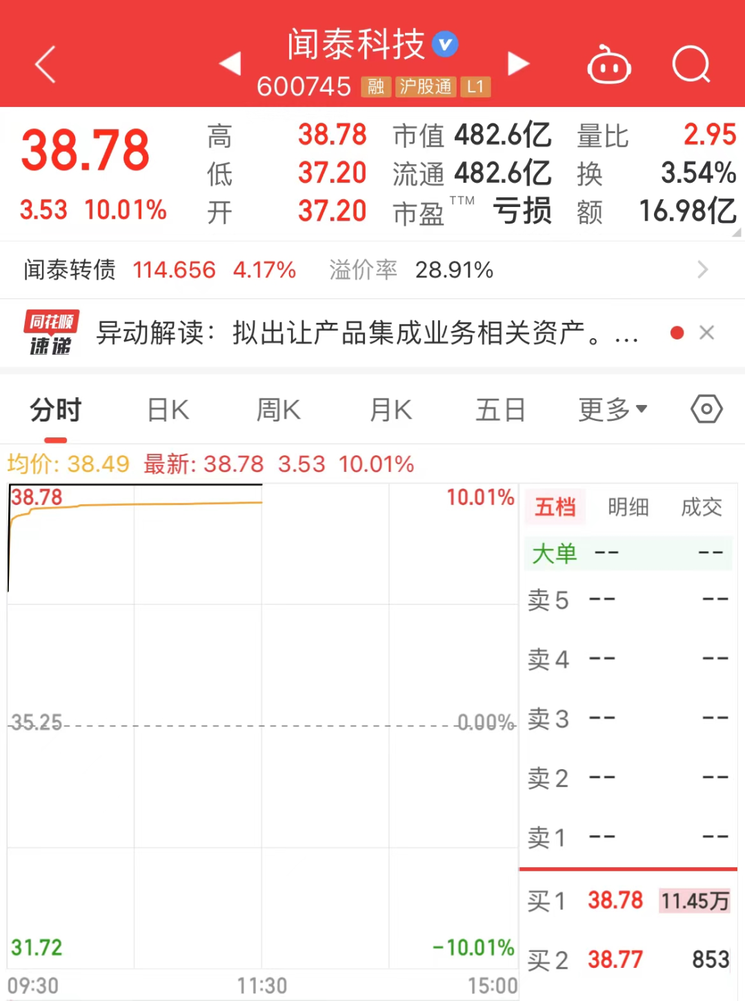 今日上午,闻泰科技(600745)开盘不到1分钟,股价直线上涨。