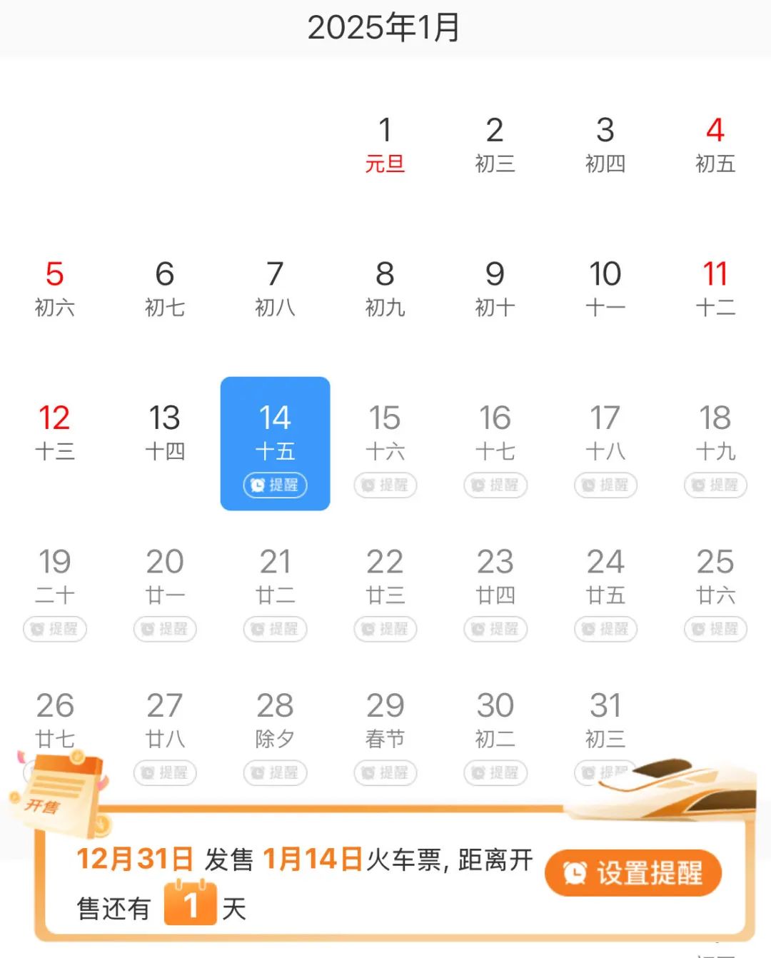 根据中国铁路规定,2025年春运高峰从2025年1月14日开始,到2月22日结束,为期40天。2024年12月31日(今天),春运高峰首日火车票开始销售。你拿到回家的票了吗?