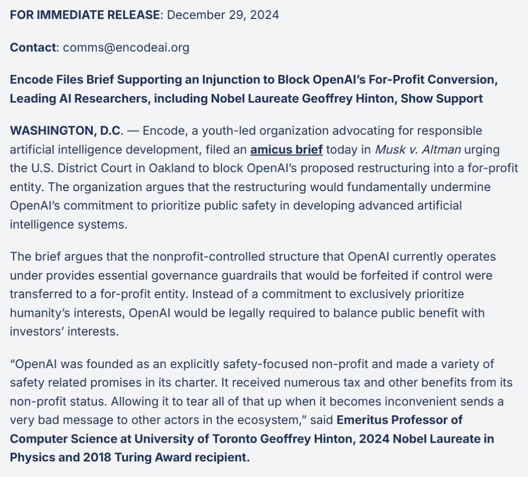 Encode 作为一个非营利组织,曾经参与加州的发起 SB 1047 人工智能安全立法。该组织提供支持伊隆的解释・为了阻止马斯克的禁令, OpenAI 转型为盈利公司。