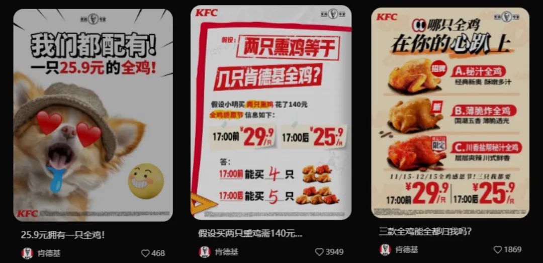 但是大多数时候企业往往也不会选择直接发帖征集意见的方式来“听劝告”,更多的是先被动地吸收网友的建议,再实施。今天的主角肯德基就是一个很好的例子。事实上,肯德基在“熏鸡事件”发生后并没有采取行动,只是一个普通的“吃瓜人”。它真正付诸行动的是,节目播出一天后,很多网友在评论区Cue肯德基和麦当劳之后才开始掌握这个流量密码。先是贴了自己的“全鸡”系列“熏鸡事件”,然后发了一系列围绕“熏鸡”的玩梗文案。最终落实到实际赞助《再见情人4》中,再一次掀起讨论热潮。可以看出肯德基非常擅长刺激热度,从最初的玩梗到最后的投资,每一个“听劝告”的时间点都可以换来热度。