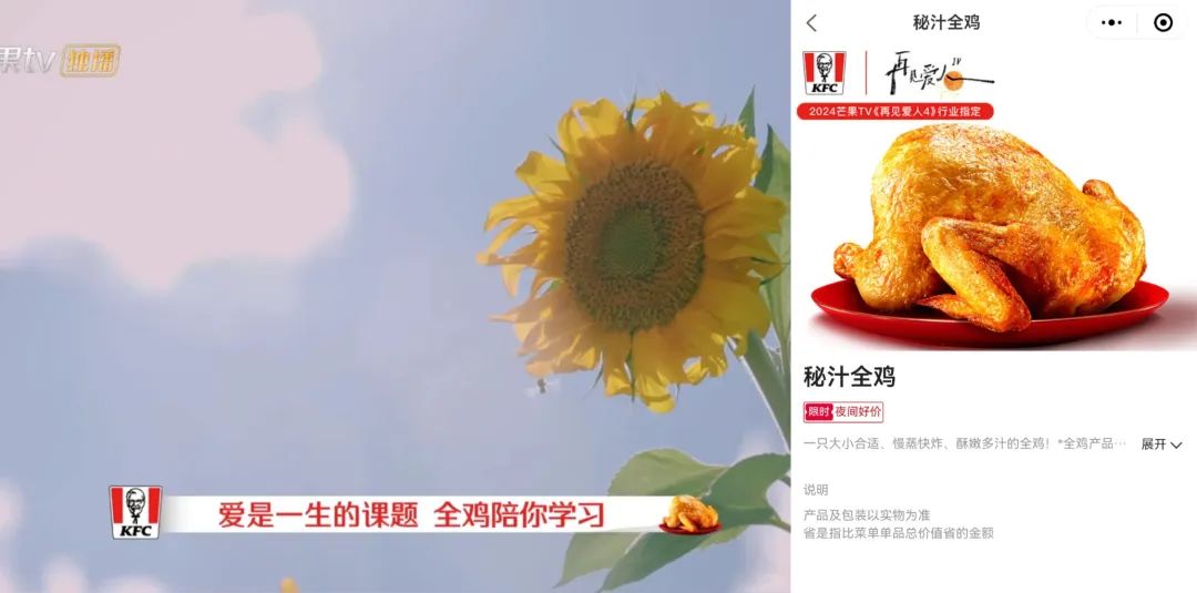 一开始以为只是说说而已,没想到肯德基有“劝”就是真听。节目播出后一天,我们开始在社交平台上积极冒泡。我们还专门推出了肯德基全鸡套餐,并在文案上互动节目“两只熏鸡等于几只肯德基全鸡?””。我以为事情到此结束。没想到,下一期节目播出后,一些眼尖网友发现肯德基随口播出了“爱情是一辈子的话题,全鸡陪你学习”这句话,默默追逐《再见爱人4》成为赞助商之一。许多网民说:“肯德基你这么听劝告,做什么都会成功。”