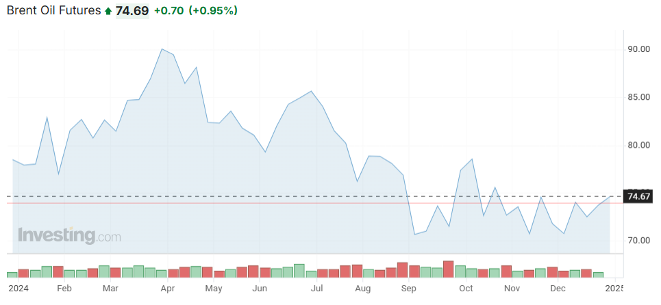 Kaneva和她的团队预测,国际标准布伦特石油将在2025年下跌到平均每桶73美元。相比之下,布伦特原油在2024年的平均价格约为80美元。