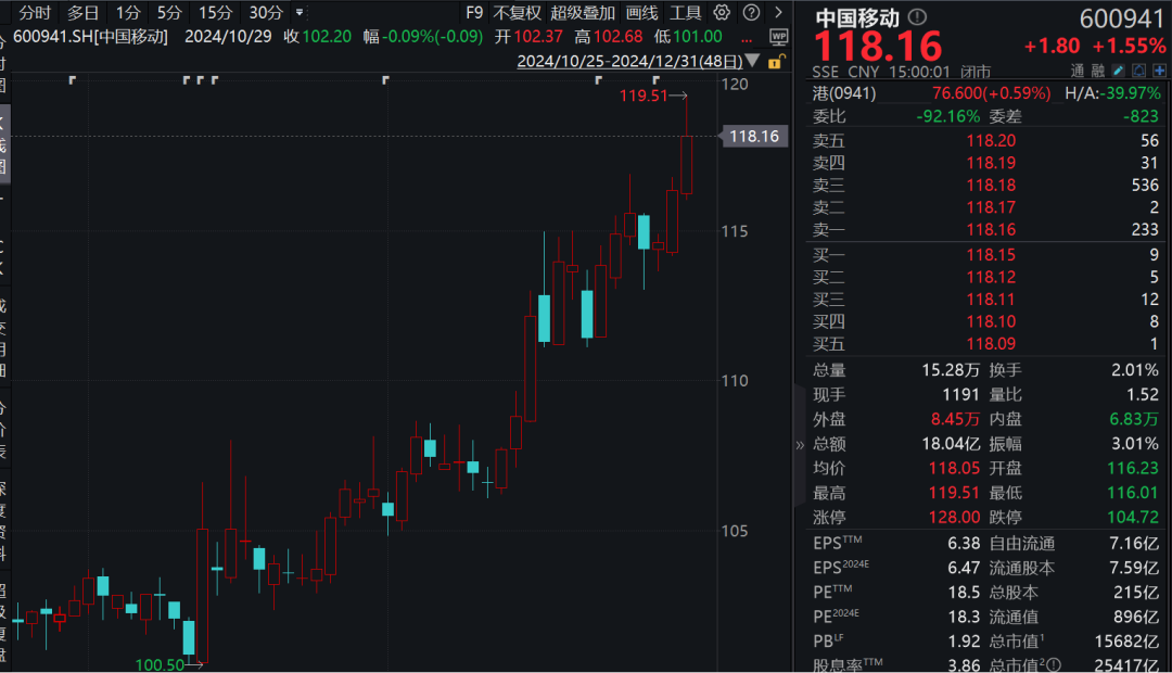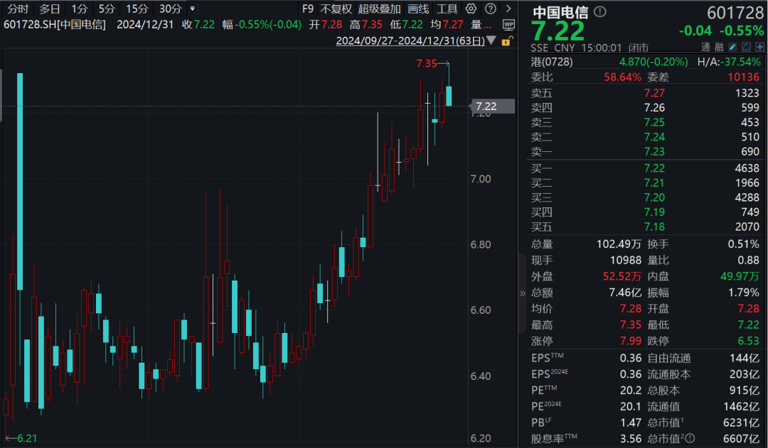 在市场热点方面,蓝筹股相对抗跌, 在电信运营板块中,中国移动和中国电信都在2024年的最后一个交易日创下了历史新高(复权,相同)。 近三个月来,港股中国移动创下新高,中国电信也在历史高点附近徘徊。