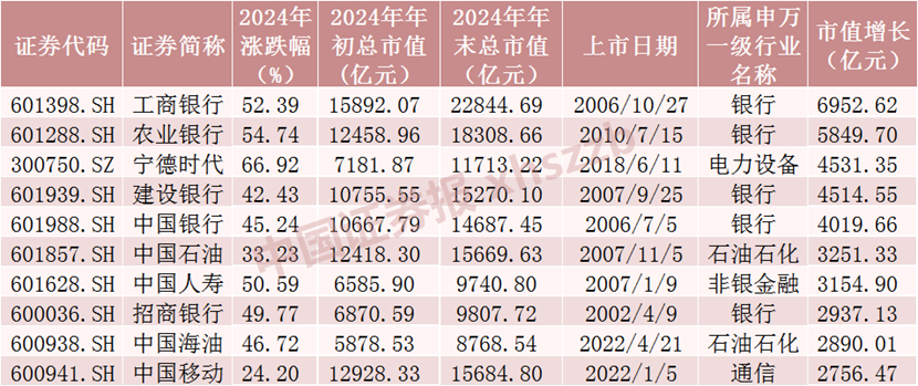 从市值增长的角度来看,银行股表现大放异彩。Wind数据显示,2024年新股上市后, 2024年市值增长最大的10只股票工商银行、农业银行、宁德时代、建设银行、中国银行、中国石油、中国人寿、招商银行、中国海油、中国移动等都是大盘股,其中5只是大盘股。2024年工商银行市值增长超过6900亿元,股价上涨52.39%。