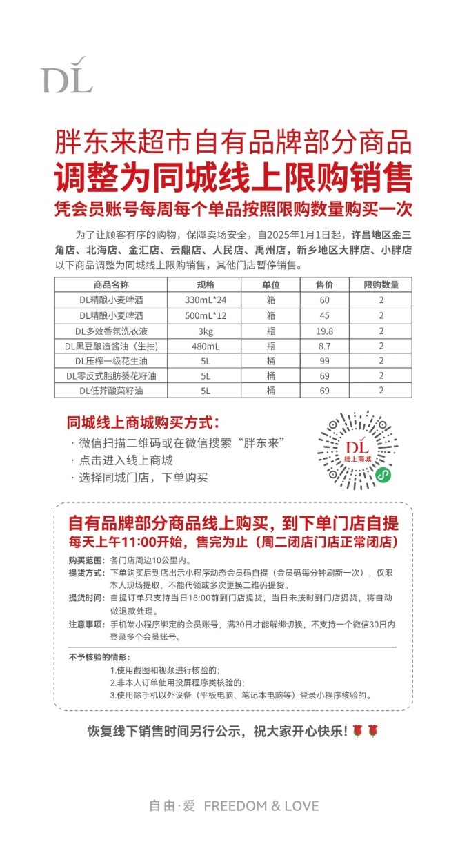 公告显示,从2025年1月1日起,新乡大胖店、小胖店共有8家门店,包括许昌金三角店、北海店、金汇店、云鼎店、人民店、禹州店。精酿小麦啤酒330ml*24/500ml*12、DL多效香氛洗衣液,DL黑豆酱油(酱油)、DL将一级花生油、DL零反式脂肪葵花籽油、DL低芥酸菜籽油等7款产品调整至同城网上限购,其他门店暂停销售;同时,公告标明了在线购买方式。
