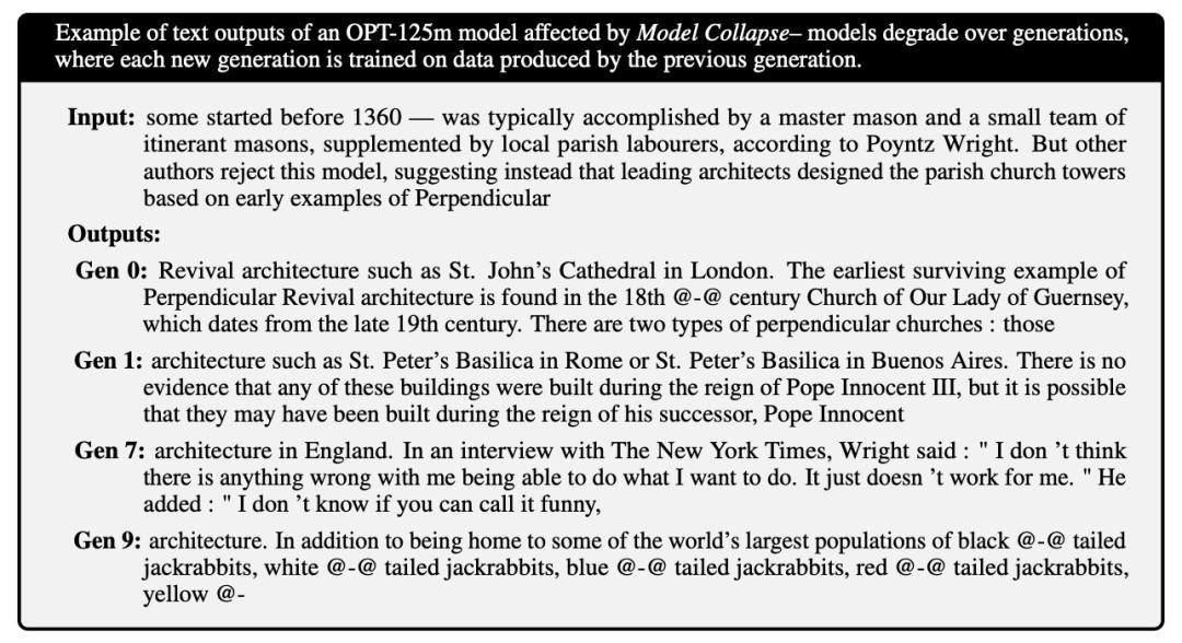 各种幻觉叠加会导致模型胡说八道。《自然》杂志上发表了一项研究,揭示了用错误的数据训练出来的模型是如何产生更多错误的数据的,以及这个反馈循环是如何导致后代模型衰退的。研究人员发现,随着模型几代人的训练,他们会失去一些深刻的知识——变得更泛泛而谈,经常会产生与问题无关的答案。
