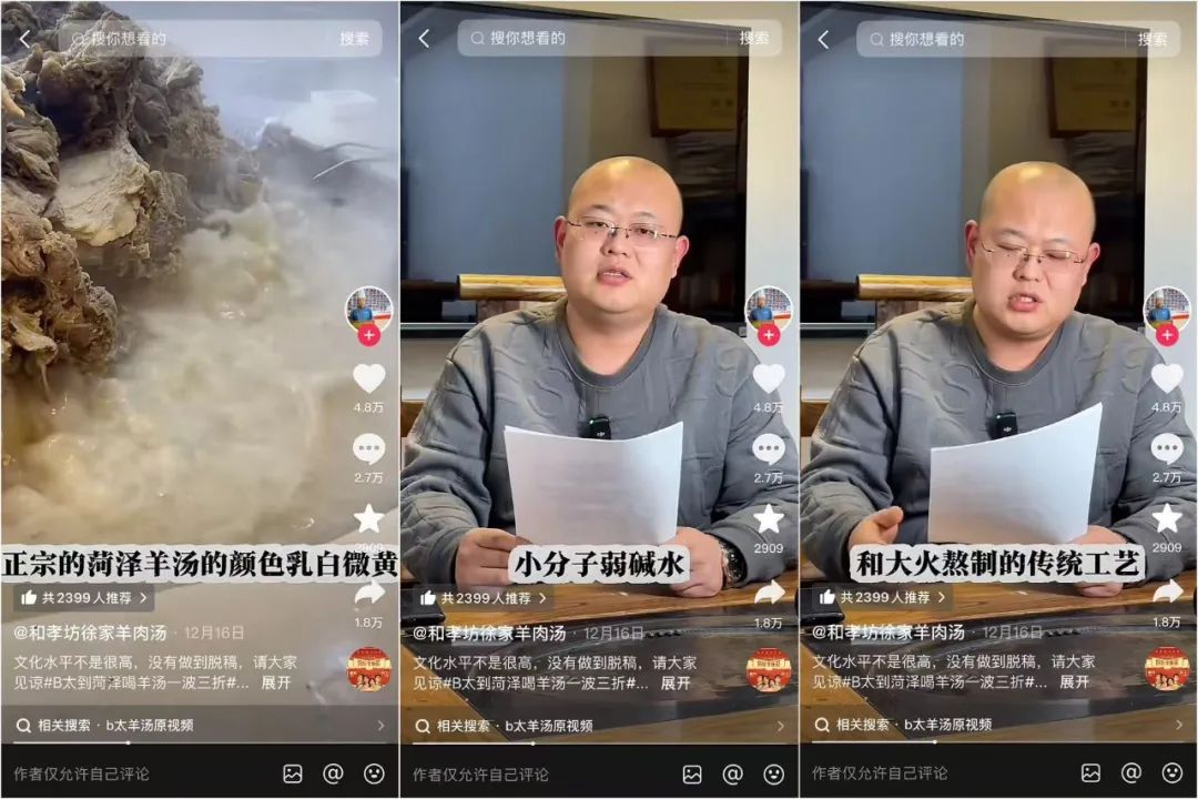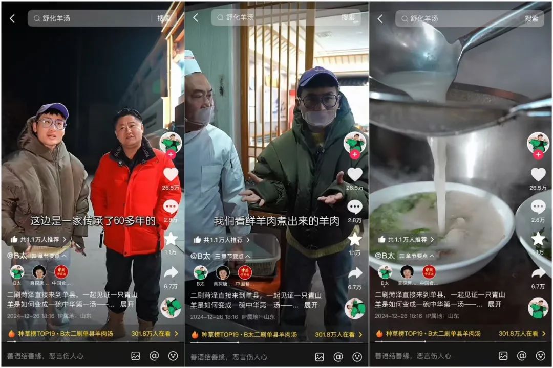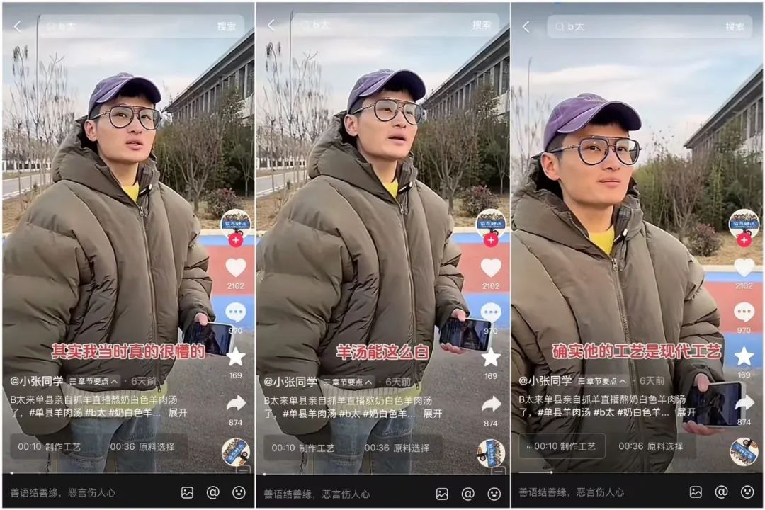 目前@B太 这个视频已经在账号上删除了,但是从网上流传的片段来看,大致和他之前的视频差不多。因为羊汤是菏泽的代表食品,B太也以此为出发点开始了自己的评价。
