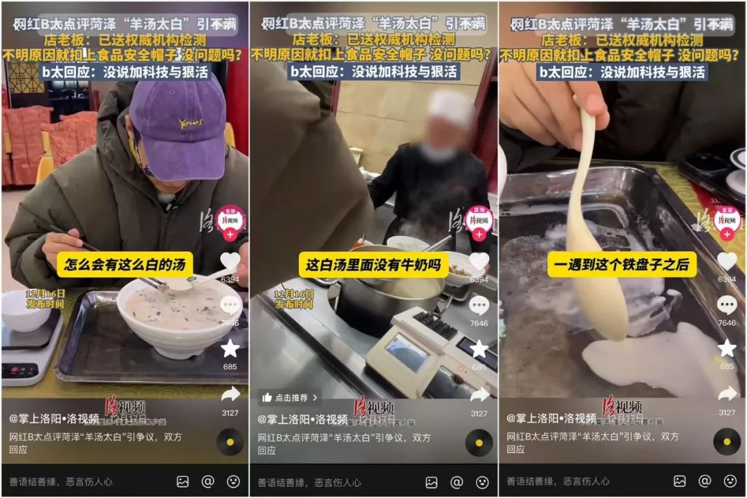 对于这个问题,虽然@B太 还发布了“第二刷菏泽羊汤”的视频。在菏泽小留大集上随意走进的一家羊汤店里,B太得到了一碗价值20元的羊汤,清汤免费加羊血。虽然还是白色的,但是明显清淡了很多。他还发了一条信息,解释说为什么羊汤这么白,并没有说商家一定要加上“科技和努力”的意思。但是网民对它的评价仍然是两极分化的,所以才有了文章开头提到的“现场熬羊汤”直播。