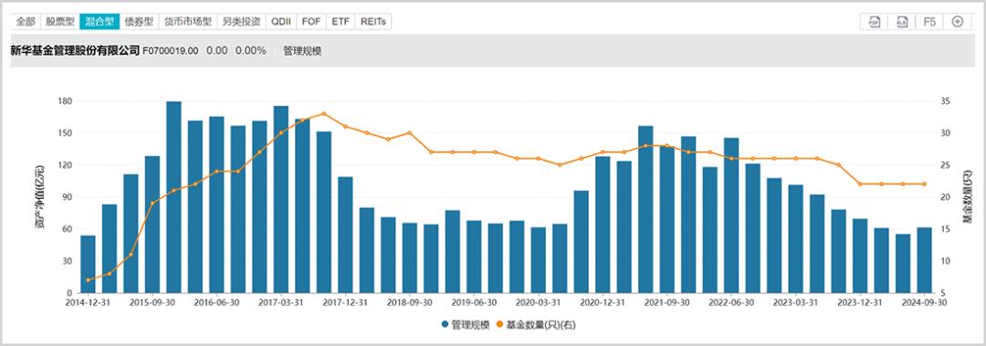 新华基金在2021年的混合基金规模为146.69亿,仍未能恢复到2015年的高峰。此后由于股市逐渐低迷,规模也逐渐下降,到2024年前三季度为61.33亿元,在所有基金中仅占11.76%,排名也降至第79位。