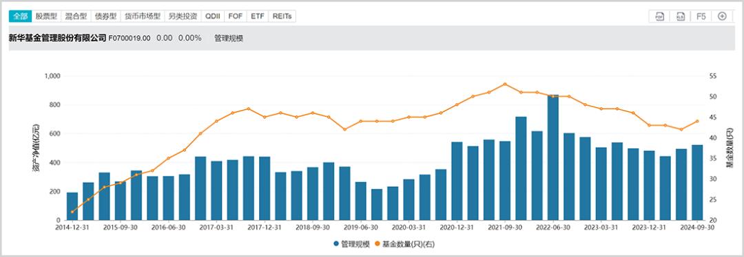 2023年2月,翟晨曦也离职,此后距离千亿规模目标越来越远。截至2024年前三季度,新华基金规模已达521.69亿元,比2022年的868.31亿元缩水346.62亿元,幅度达到40%。