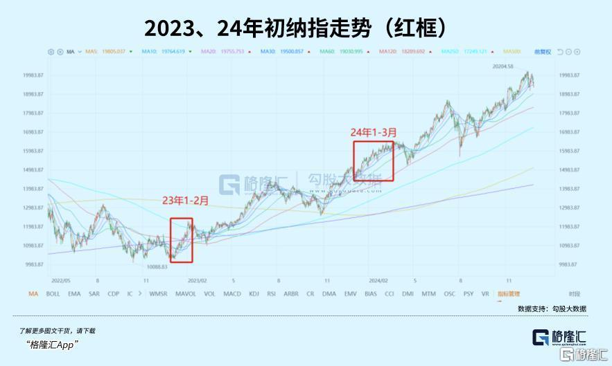回顾当时前后一段时间的市场走势,我们会发现,2023年7-10月,美股经历了近三个月的盘整,在11月初美联储货币宽松表态后,又回到了上升趋势。截至2023年12月,该指数已超过7月份的高点。进入2024年,随后开始长达3个月的涨幅。