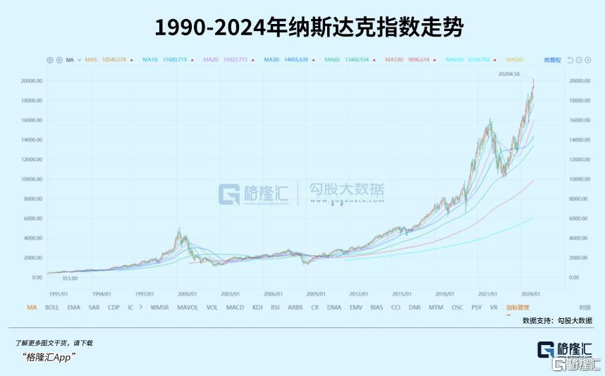 首先,纳斯达克指数始终紧跟技术产业发展,可以包括世界上最宝贵的技术公司,从计算机时代的微软和苹果,到互联网上的亚马逊、谷歌和meta,然后是电动汽车的特斯拉,以及AI时代的英伟达,等等。