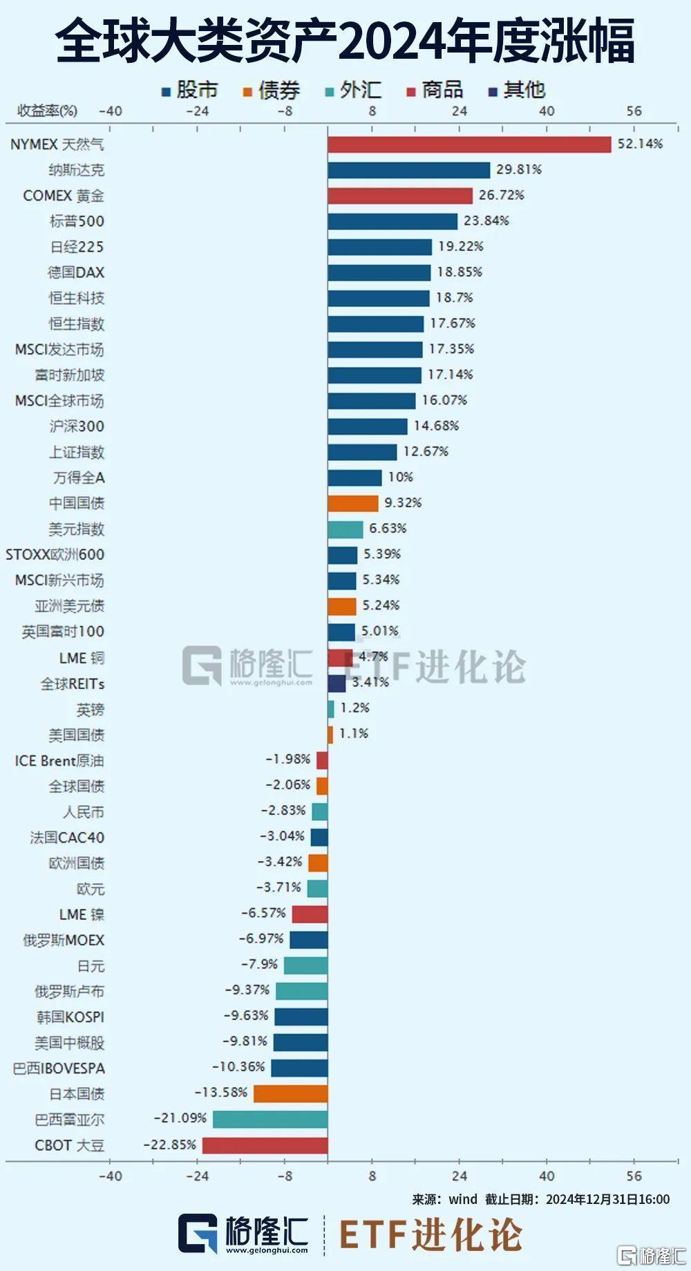 纳斯达克指数今年上涨了29.81%,在下图统计的今年全球大类资产上涨中排名第二。相比之下,标准普尔500指数上涨了23.84%,日经225指数上涨了19.22%,恒生科技指数上涨了18.7%,沪深300指数上涨了14.68%。