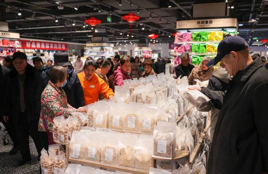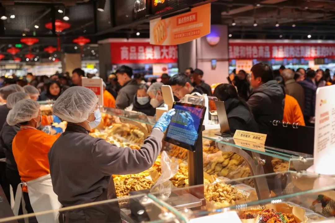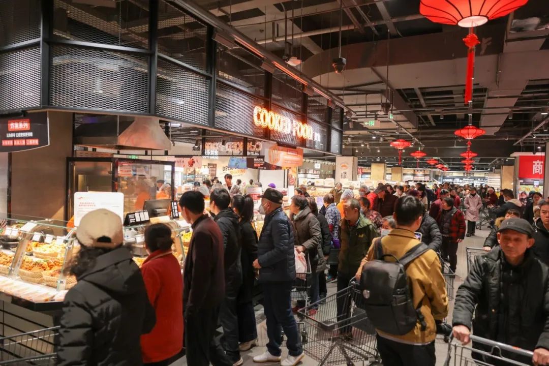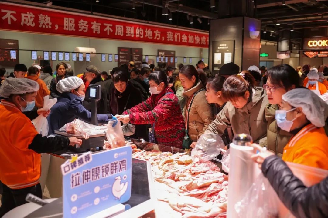 12月31日上午9:30开业后,一步步高广场一楼的超市里挤满了人。无论是热流燃烧的熟食区、诱人的烘焙区,还是收集全球爆款产品的食品区,都挤满了来购买的消费者。山药、鸡蛋、牛肉、樱桃等“顶级”产品上架后被抢购一空。