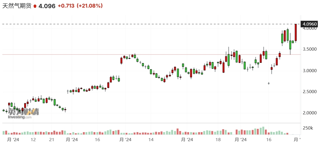 “历史性寒流”强势来袭,美国天然气期货日内大幅上涨24%。