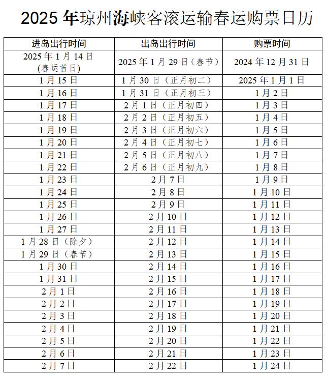 根据琼州海峡客滚运输春运高峰期进岛机票预售期为15天,出岛机票预售期为30天的管理规则,从12月31日起,旅客可在春运高峰第一天(2025年1月14日)购买进岛方向机票和大年初一(2025年1月29日)出岛方向机票。需要过海的司机和乘客可以通过“琼州海峡轮渡管家”和“铁路轮渡”微信微信官方账号提前预约购票;机票售出时,乘客可以通过替补登记。如果运输能力符合增加航班条件,航运公司将根据替补登记情况及时增加航班。