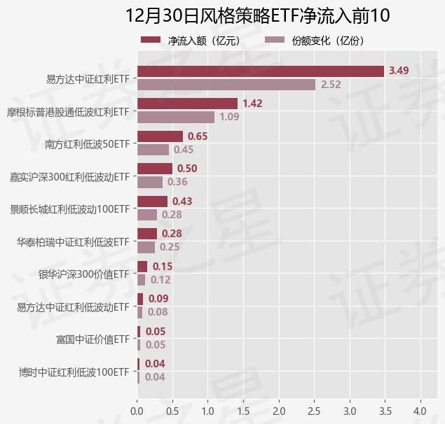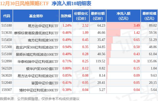 当天有 17 只风格策略 ETF 资金净流入,其中E基金净流入排名第一的是E基金中证红利。 ETF(515180),份额增加 2.52 十亿份,净流入额为 3.49 亿元。