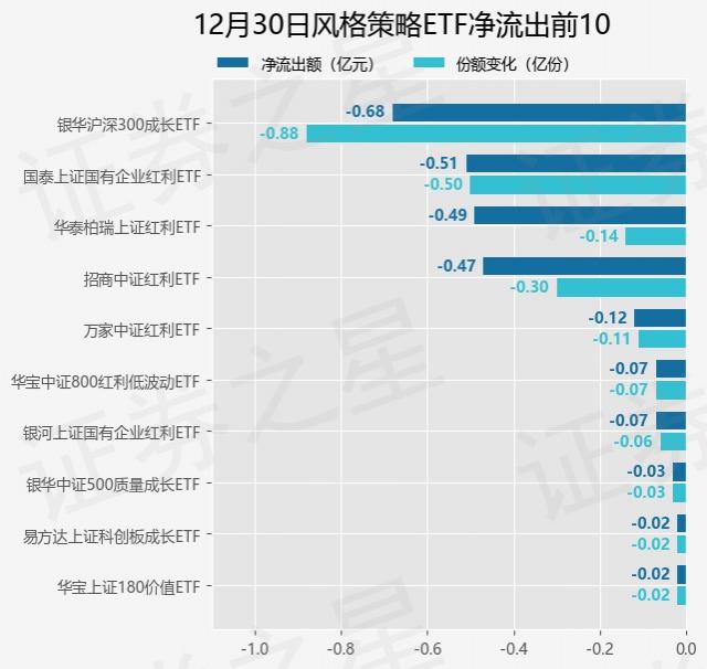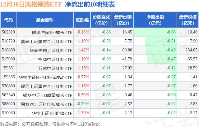 当天有 13 只风格策略 ETF 资金净流出出现在基金中,其中银华沪深股市净流出排名第一。 300 成长 ETF(562310),份额下降 8800.0 万份,净流出额为 6844.76 万元。