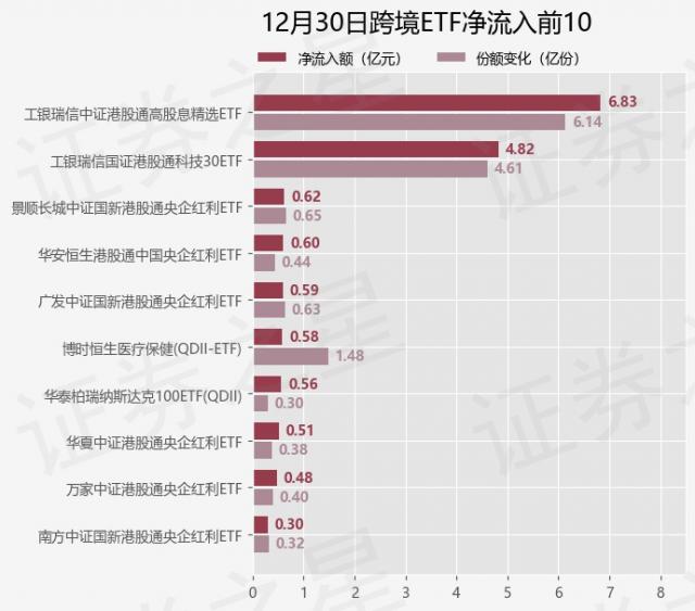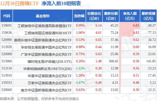 当天有 50 只跨境 ETF 资金净流入出现,其中工银瑞信中证港股通高股息优选排名第一。 ETF(159691),份额增加 6.14 十亿份,净流入额为 6.83 亿元。