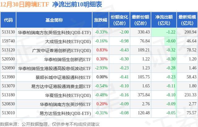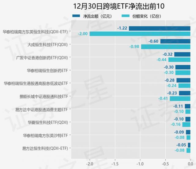 当天有 23 只跨境 ETF 资金净流出,其中华泰柏瑞南方东英恒生科技排名第一。 ( QDII-ETF ) (513130),份额下降 2.0 一亿份,净流出额为 1.22 亿元。