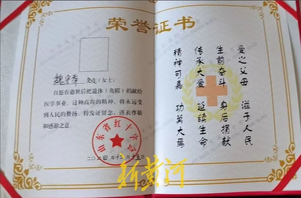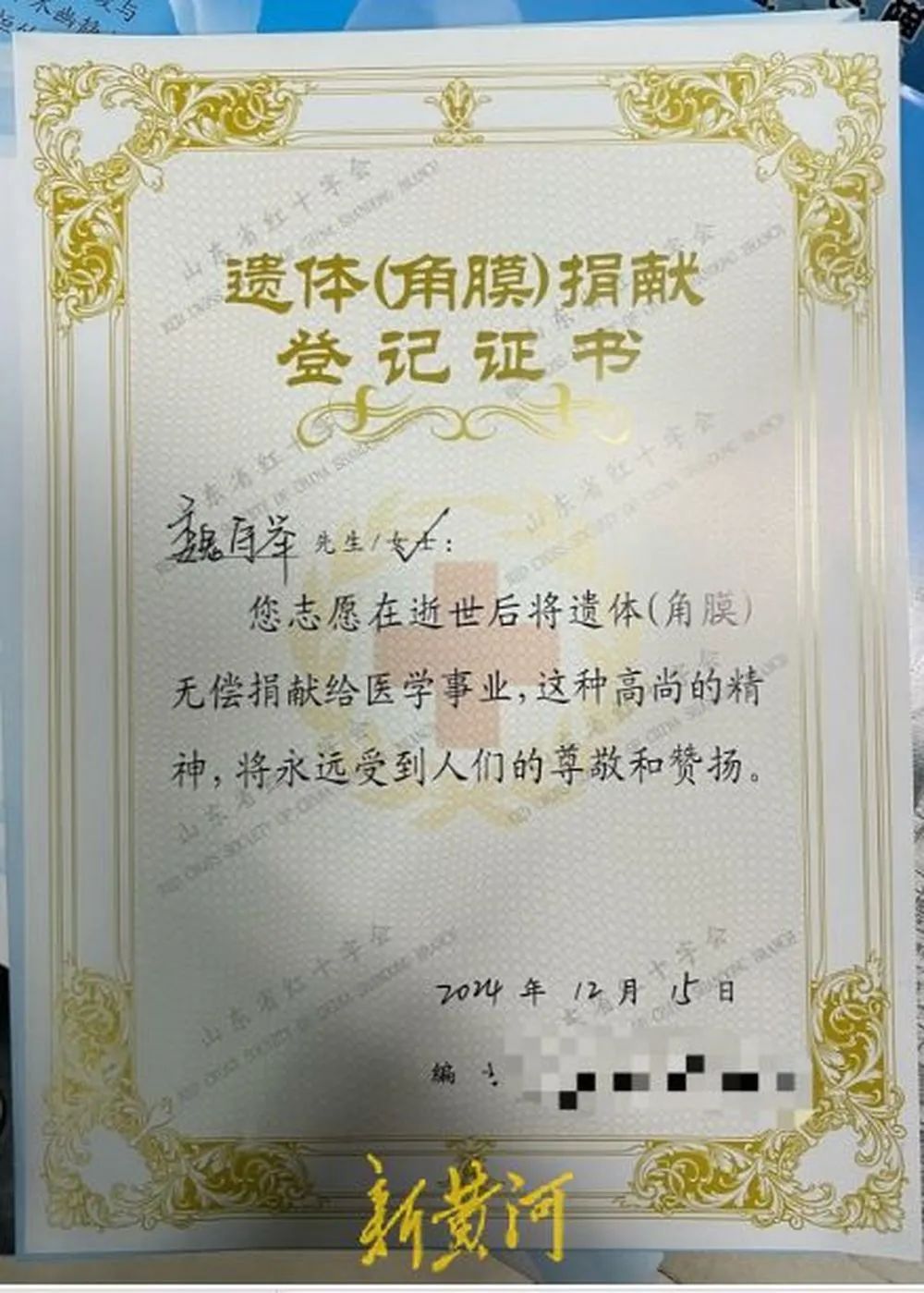 12月15日,59岁的魏守举在山东第二医科大学附属医院安详地离开了人生的最后一段旅程。她的家人按照自己的愿望捐献了角膜和遗体,给角膜盲患者带来了光明,为医学研究和教育做出了贡献。