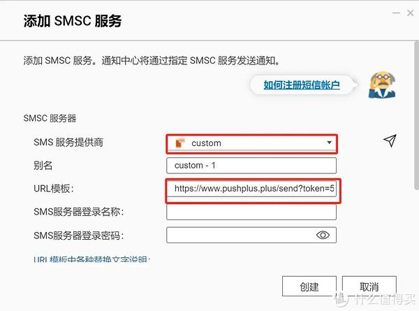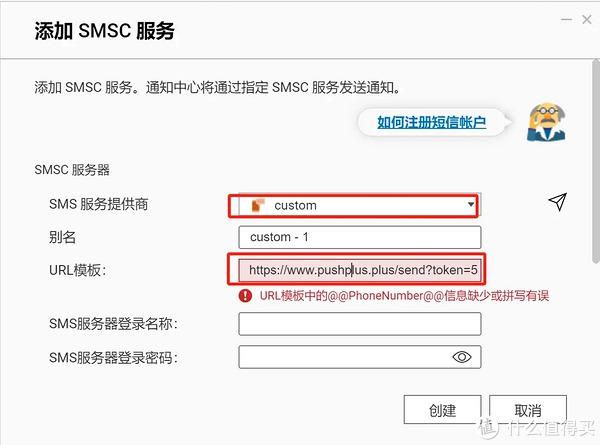 在【添加 SMSSC 服务】中,SMSC 服务器挑选 custom,URL 将上述复制的链接粘贴到模板上,粘贴后,会显示出来。 URL 模板中心 @@PhoneNumber@@缺乏拼写信息是错误的。